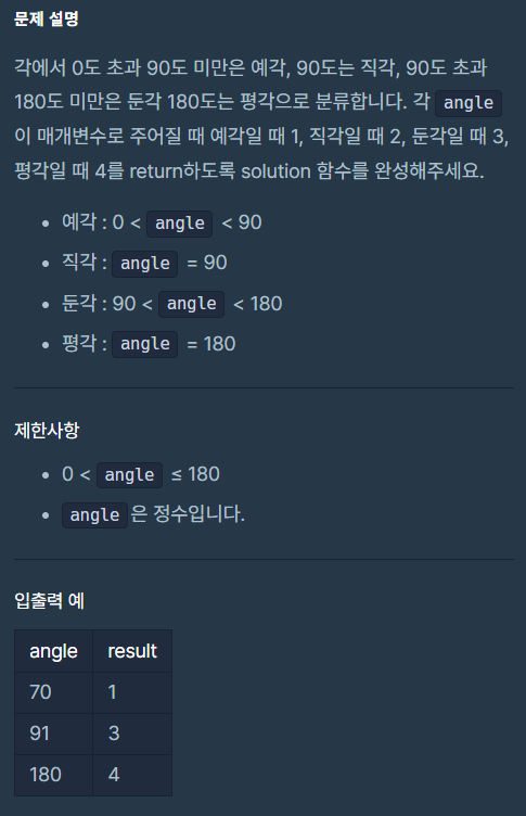return angle == 180 ? 4 : angle < 90 ? 1 : angle == 90 ? 2 : angle > 90 ? 3 : 0;