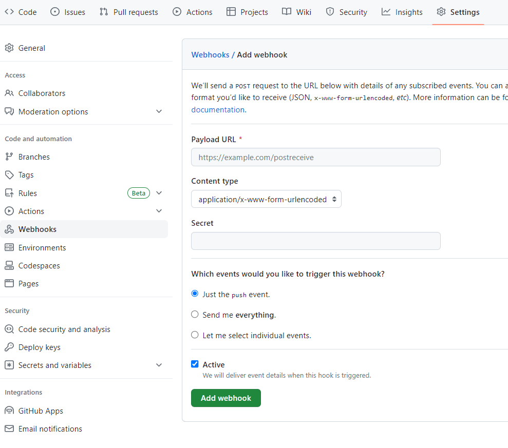 위에서 설정했던 내 리포지터리 > Settings > Webhooks > Add Webhook