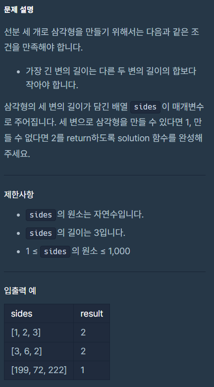 return sides[2] >= sides[0]+sides[1] ? 2 : 1;