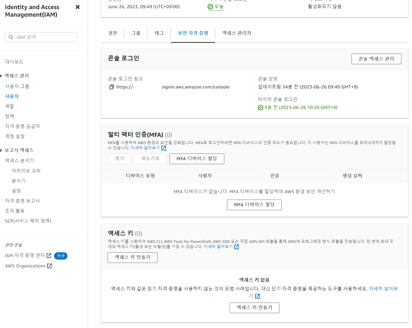 - 계정 별칭 생성 => iam 검색 + 엔터 > 우측에서 가능