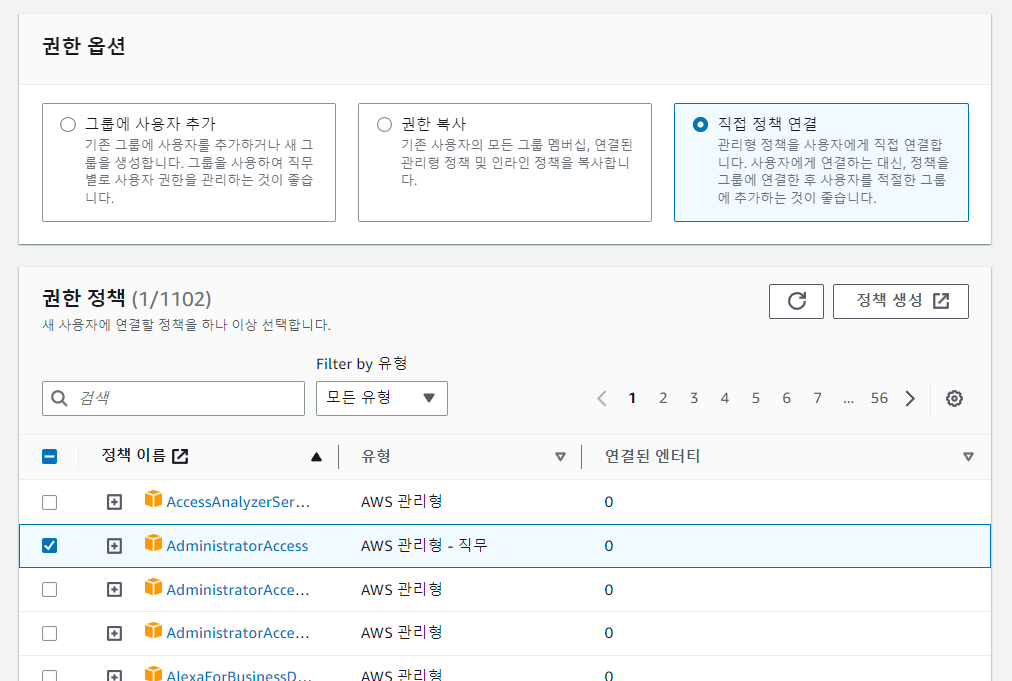 - AdministratorAccess 체크 후에 다음 > 사용자 생성