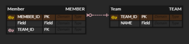 - @JoinColumn(name="TEAM_ID") : 외래 키를 매핑할 때 사용한다. name 속성에는 매핑할 외래 키 이름을 지정한다. 이 어노테이션은 생략할 수 있다.